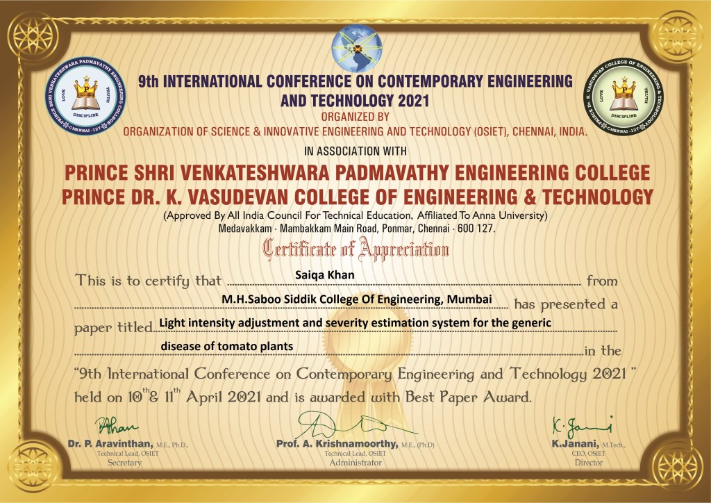 Received an award for my research on light intensity adjustment and severity estimation system for generic disease of Tomato plants at “9th International Conference on Contemporary Engineering and Technology 2021” held on 10th and 11th April 2021.